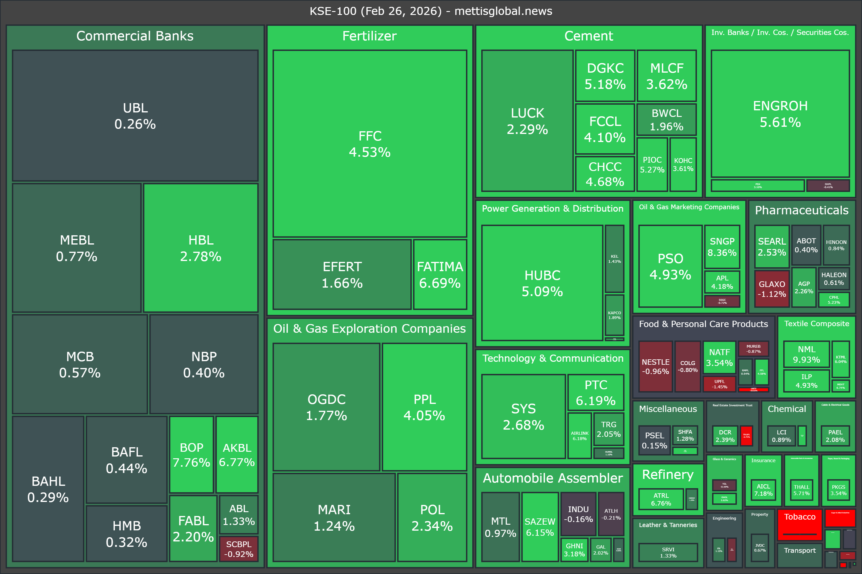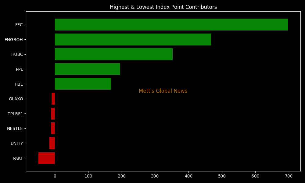 In terms of index-point contribution, major support came from FFC (+697.47pts), ENGROH (+467.13pts), HUBC (+352.64pts), PPL (+194.52pts), and HBL (+168.31pts).