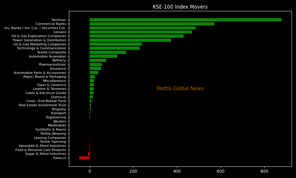 Sector-wise, the KSE-100 Index was primarily supported by Fertilizer (+878.55pts), Commercial Banks (+570.63pts), Investment Banks/Investment Companies/Securities Companies (+485.44pts), Cement (+467.86pts), and Oil & Gas Exploration Companies (+430.34pts).