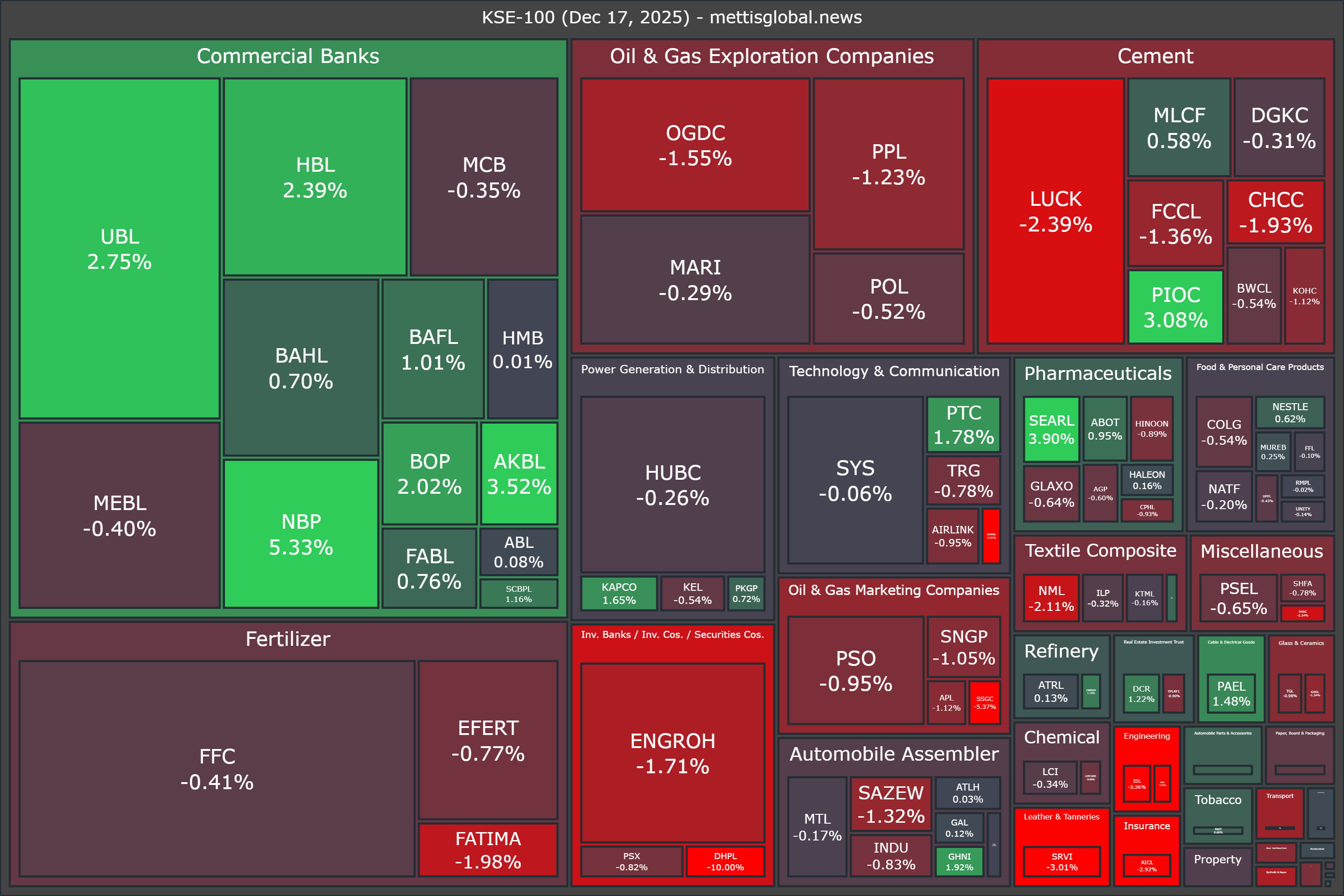 On the other hand, top gainers were NBP (+5.33%), SEARL (+3.90%), AKBL (+3.52%), PIOC (+3.08%), and UBL (+2.75%).