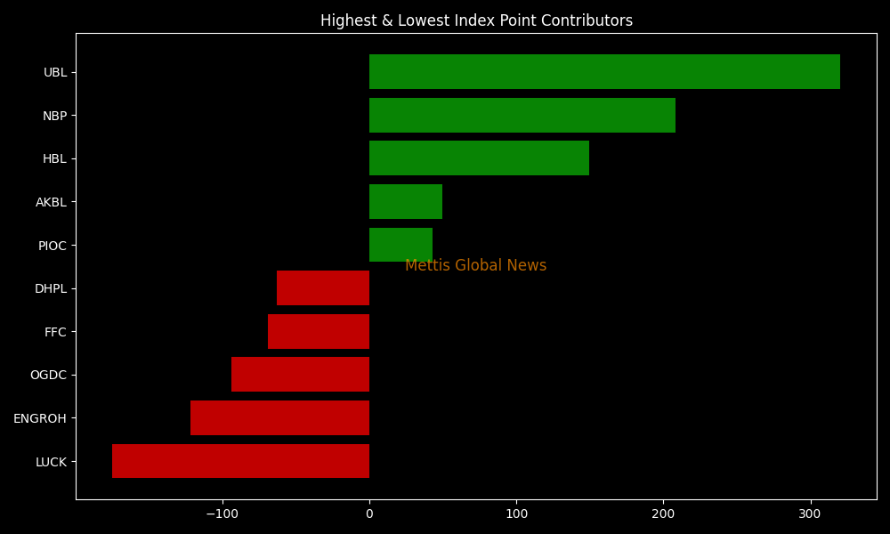 In terms of index-point contributions, companies that dragged the index lower were LUCK (-174.69pts), ENGROH (-121.74pts), OGDC (-93.83pts), FFC (-69.22pts), and DHPL (-63.11pts).