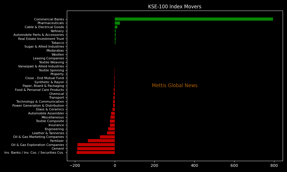 Sector-wise, KSE-100 Index was let down by Inv. Banks / Inv. Cos. / Securities Cos. (-190.91pts), Cement (-188.84pts), Oil & Gas Exploration Companies (-187.37pts), Fertilizer (-134.84pts), and Oil & Gas Marketing Companies (-75.07pts).