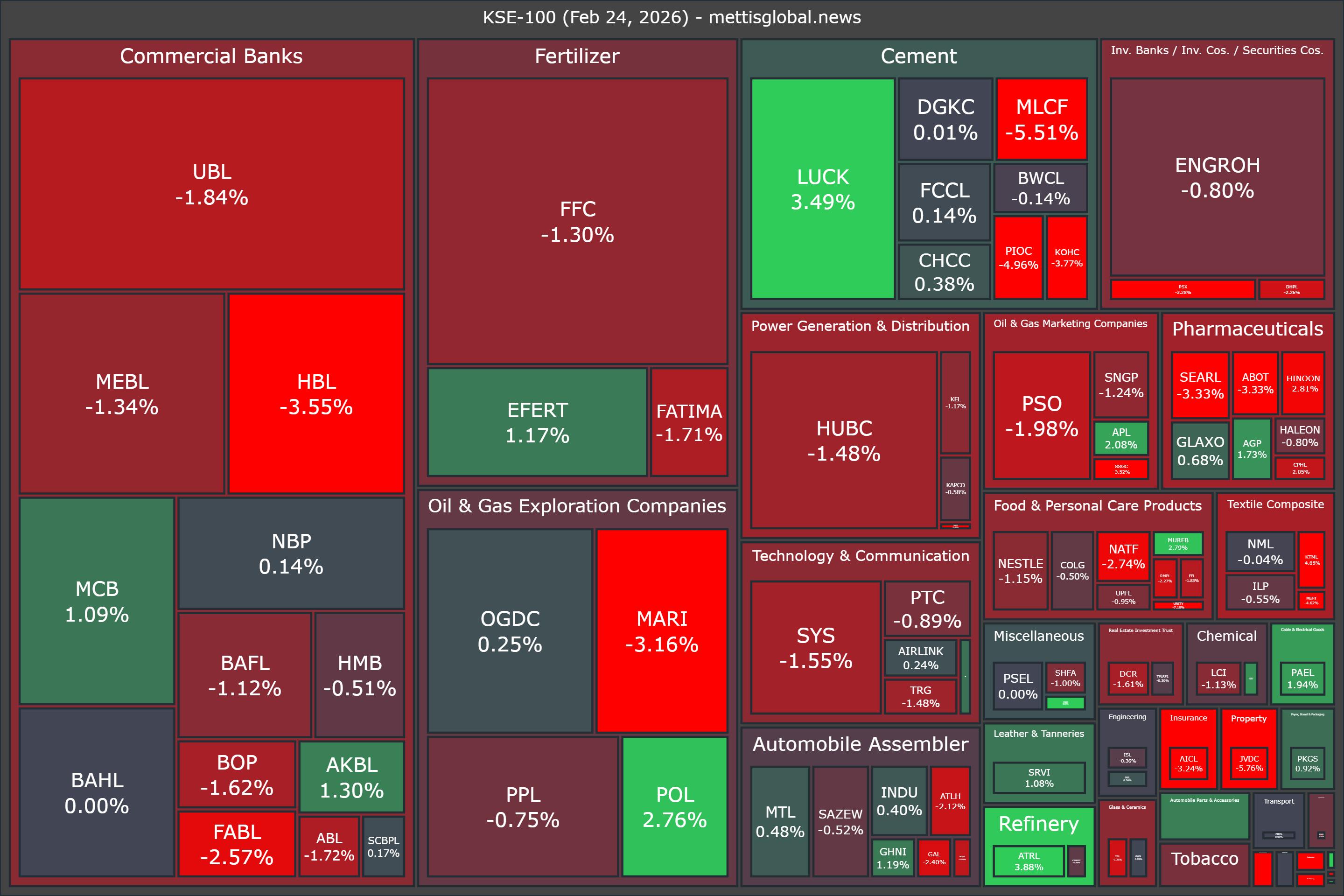 February 24, 2026 (MLN): The KSE-100 Index extended its losses on Tuesday, as investors remained cautious ahead of key external developments and ongoing global trade uncertainties, keeping market sentiment firmly in bearish territory.