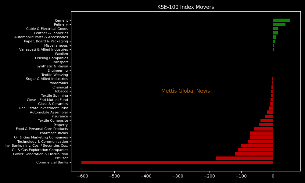 Sector-wise, the KSE-100 Index was primarily weighed down by Commercial Banks (-603.34pts), Fertilizer (-180.60pts), Power Generation & Distribution (-120.38pts), Oil & Gas Exploration Companies (-109.63pts), and Investment Banks/Investment Companies/Securities Companies (-99.52pts).