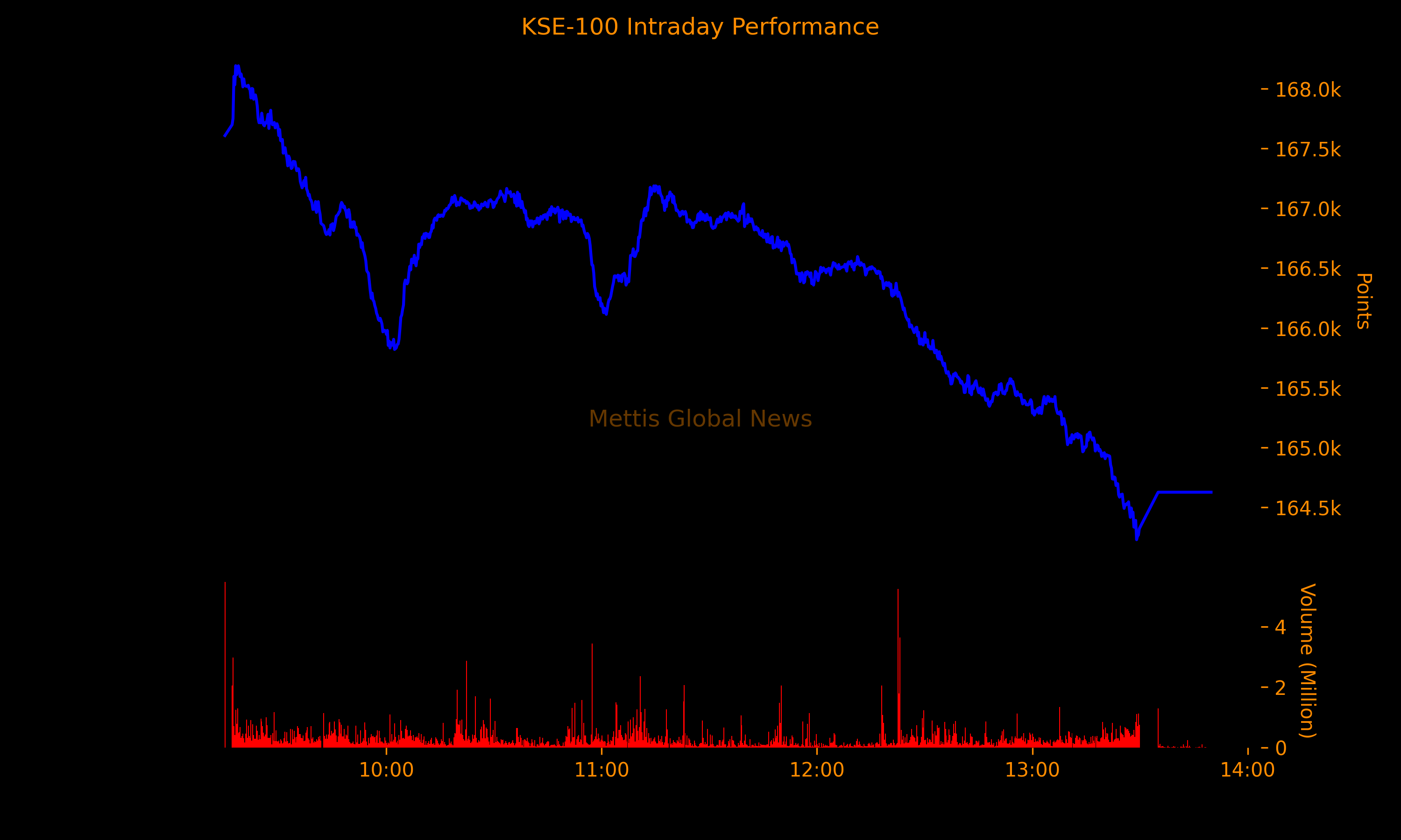 The benchmark index closed at 164,626.29, registering a decline of 1,632.25 points or 0.98%.