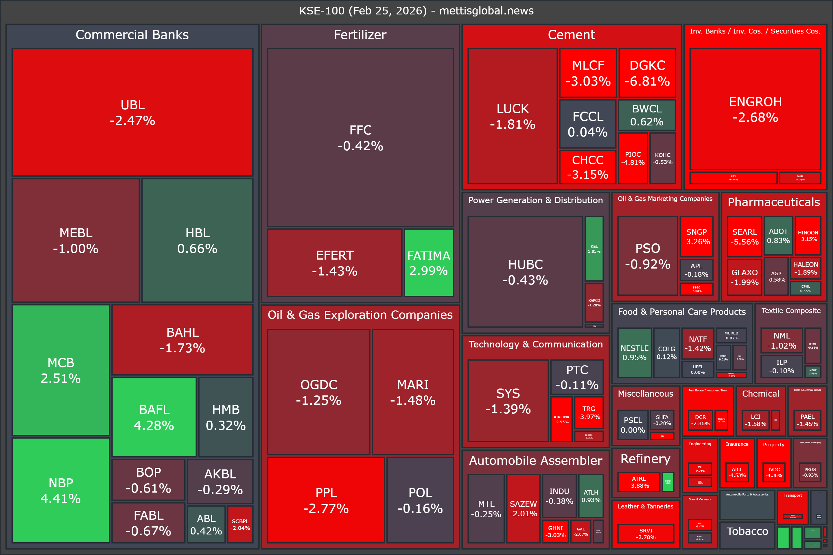 February 25, 2026 (MLN): The KSE-100 Index extended its downward trajectory on Wednesday, as persistent selling pressure across heavyweight sectors kept investors cautious amid ongoing economic and global uncertainties.