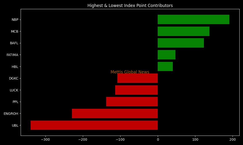In terms of index-point impact, major drags on the benchmark were UBL (-339.30pts), ENGROH (-228.93pts), PPL (-137.96pts), LUCK (-113.82pts), and DGKC (-107.82pts).