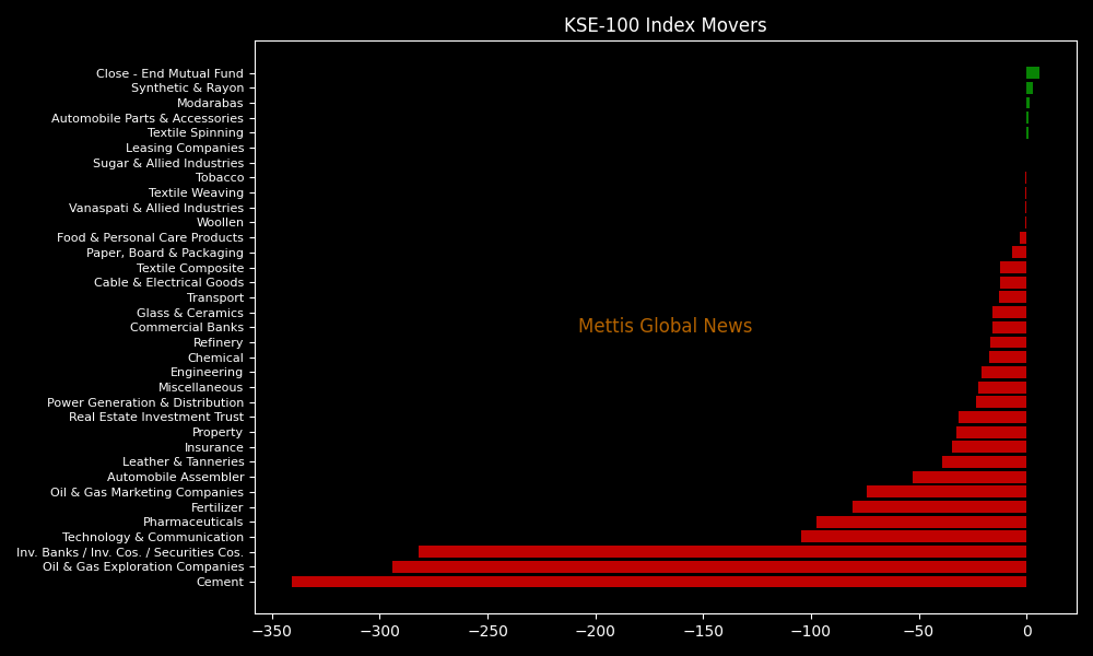 Sector-wise, the KSE-100 Index was primarily weighed down by Cement (-340.69pts), Oil & Gas Exploration Companies (-294.25pts), Investment Banks/Investment Companies/Securities Companies (-282.11pts), Technology & Communication (-104.34pts), and Pharmaceuticals (-97.51pts).