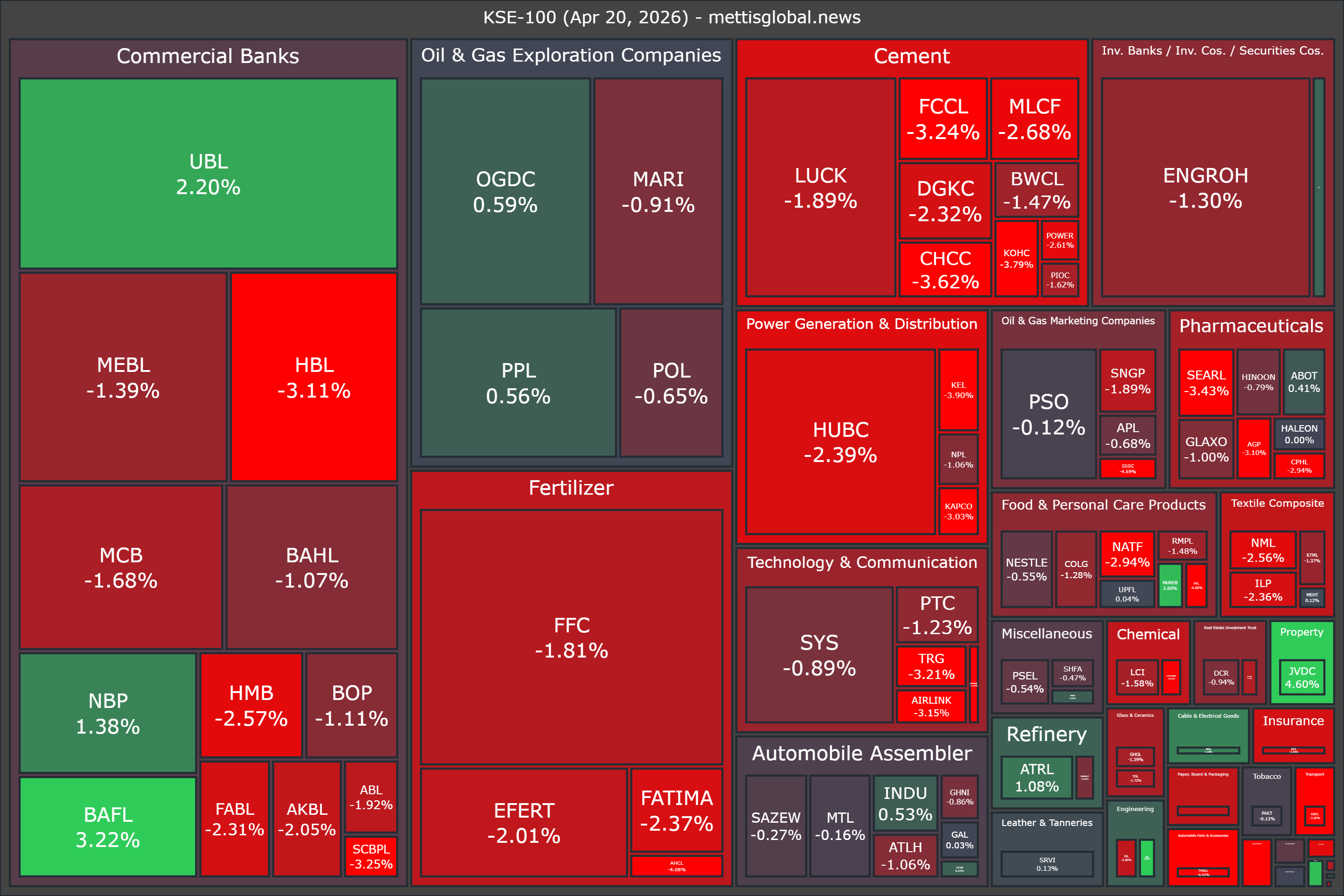 April 20, 2026 (MLN): Stocks at the Pakistan Stock Exchange ended Monday’s session in the red, although the benchmark KSE-100 Index recovered significantly from intraday lows as late-session buying helped trim earlier steep losses.