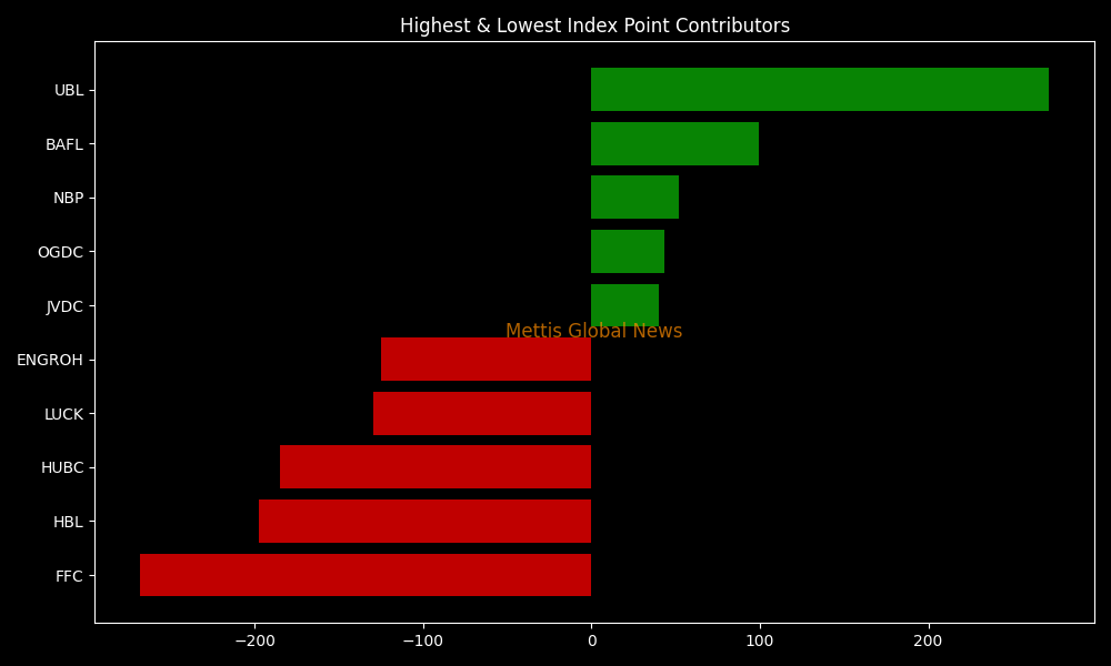 In terms of index-point contribution, the decline was driven by FFC (-268.01 points), HBL (-197.47 points), HUBC (-185.08 points), LUCK (-129.37 points), and ENGROH (-124.96 points). Meanwhile, support came from UBL (+271.64 points), BAFL (+99.18 points), NBP (+51.86 points), OGDC (+43.07 points), and JVDC (+39.85 points).