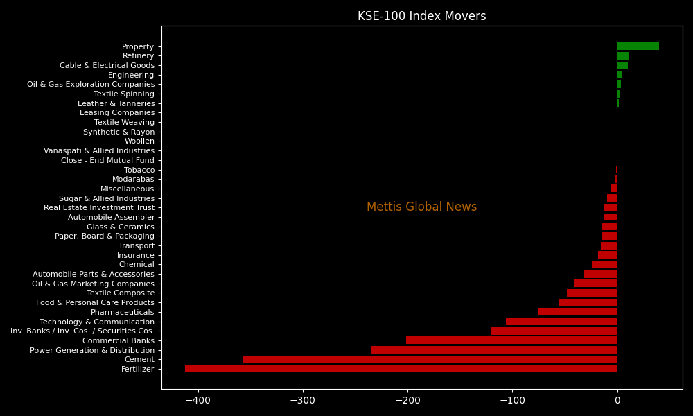 Sector-wise, the KSE-100 Index was weighed down by Fertilizer (-412.18 points), Cement (-356.55 points), Power Generation & Distribution (-234.64 points), Commercial Banks (-201.50 points), and Investment Banks/Companies/Securities Companies (-120.30 points). Some support emerged from property, refinery, and engineering sectors.
