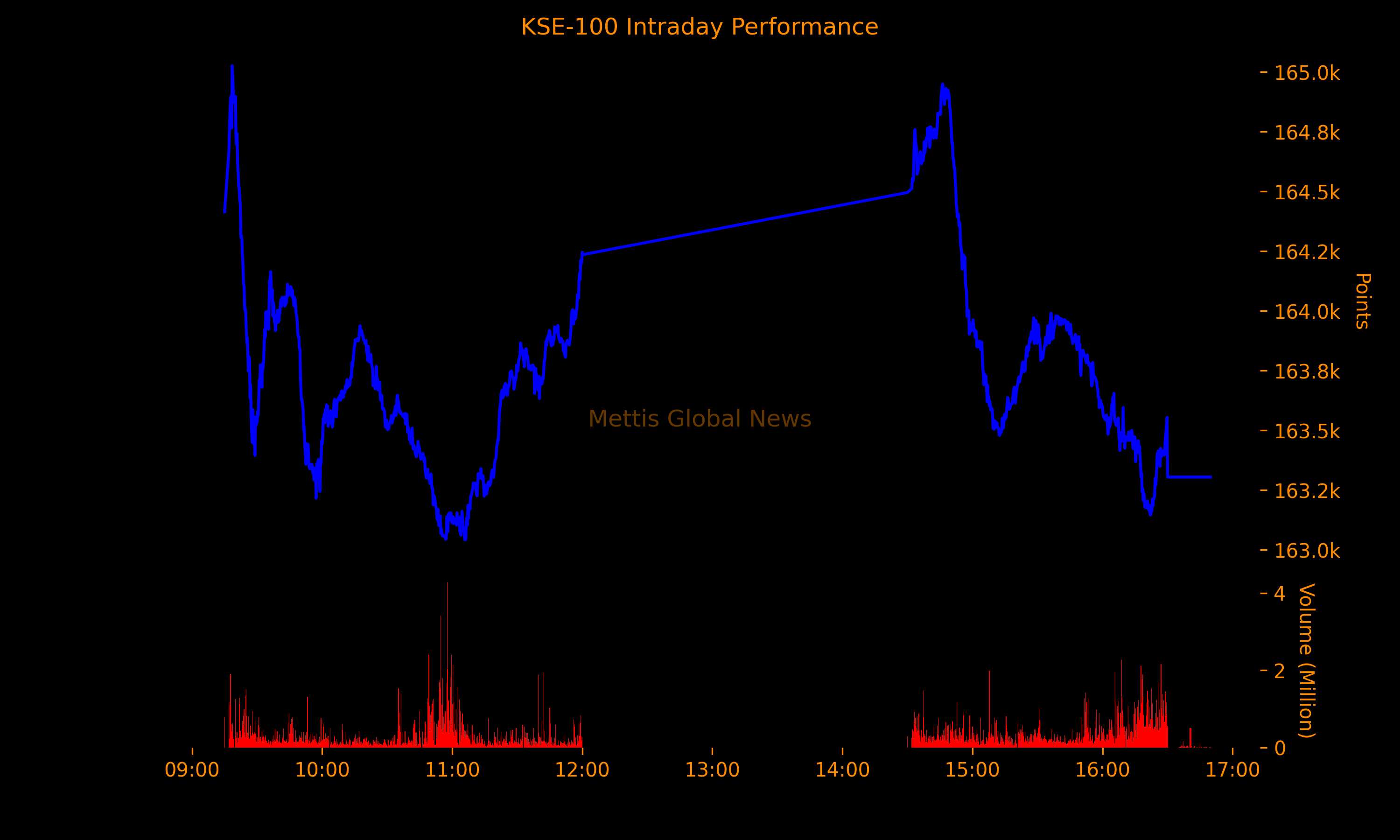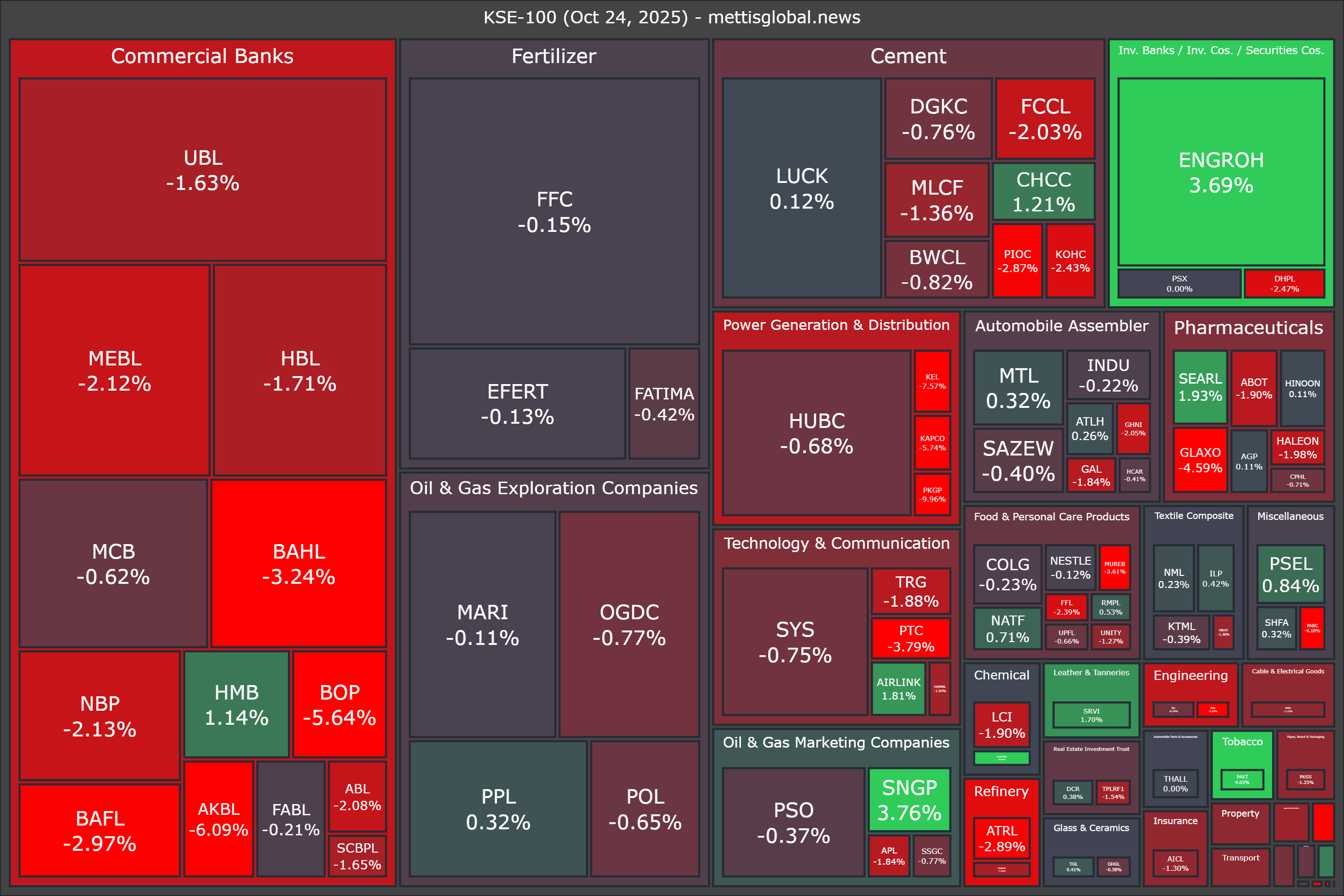 October 24, 2025 (MLN): The benchmark KSE-100 Index concluded Friday's trading session at 163,304.13, showing a decrease of 1,286.28 points or 0.78%.