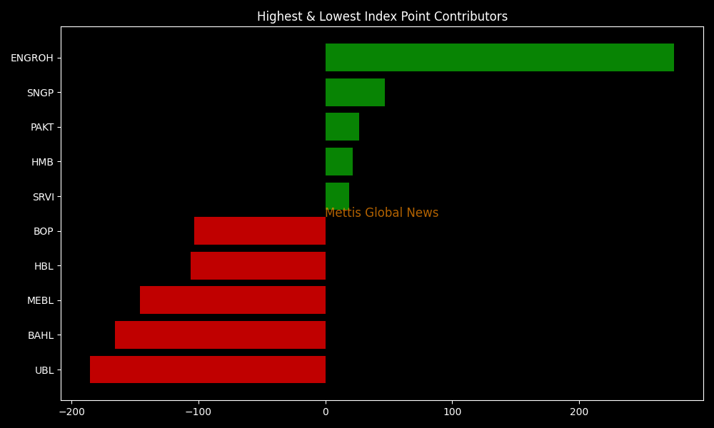 In terms of index-point contributions, companies that dragged the index lower were UBL (-185.37pts), BAHL (-166.12pts), MEBL (-146.15pts), HBL (-106.25pts), and BOP (-103.17pts).