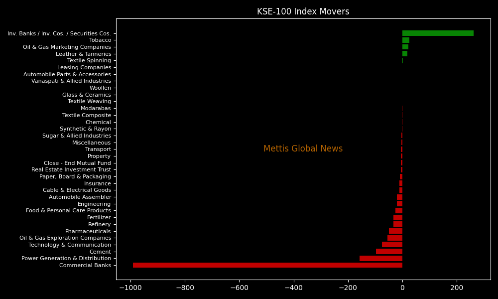 Sector-wise, KSE-100 Index was let down by Commercial Banks (-990.78pts), Power Generation & Distribution (-156.83pts), Cement (-97.21pts), Technology & Communication (-74.00pts), and Oil & Gas Exploration Companies (-54.89pts).