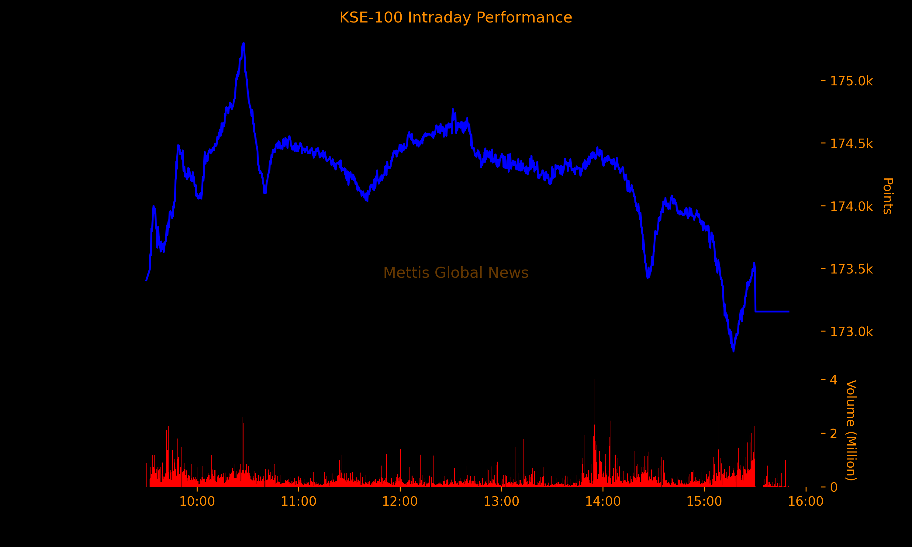 The KSE-100 Index settled at 173,155.79, up 959.09 points or 0.56%. The market remained positive throughout the session, hitting an intraday high of 175,298.11 (+3,101.41 points) and a low of 172,837.79 (+641.09 points), reflecting sustained buying interest.