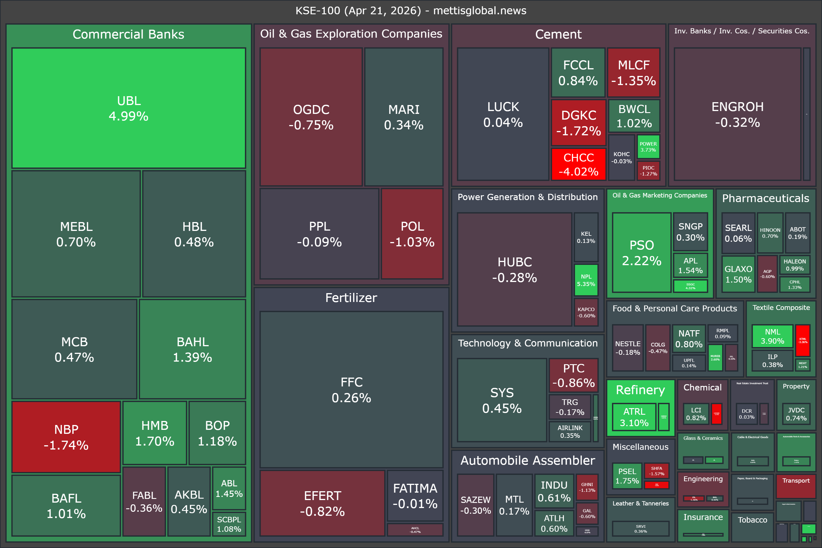 April 21, 2026 (MLN): Stocks at the Pakistan Stock Exchange closed higher on Tuesday, with the benchmark KSE-100 Index extending gains as improved external inflows and easing global oil prices lifted investor sentiment.