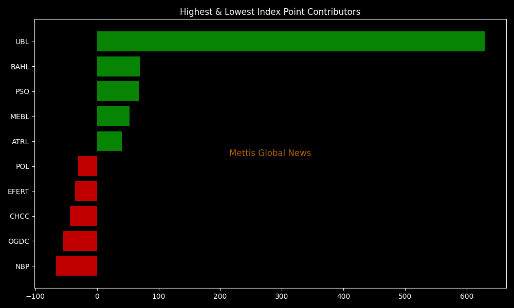 In terms of index-point contribution, the upside was largely driven by UBL (+629.40 points), BAHL (+69.49 points), PSO (+68.12 points), MEBL (+53.10 points), and ATRL (+40.43 points). Meanwhile, some pressure came from NBP (-66.33 points), OGDC (-54.45 points), CHCC (-43.91 points), EFERT (-35.33 points), and POL (-30.43 points).