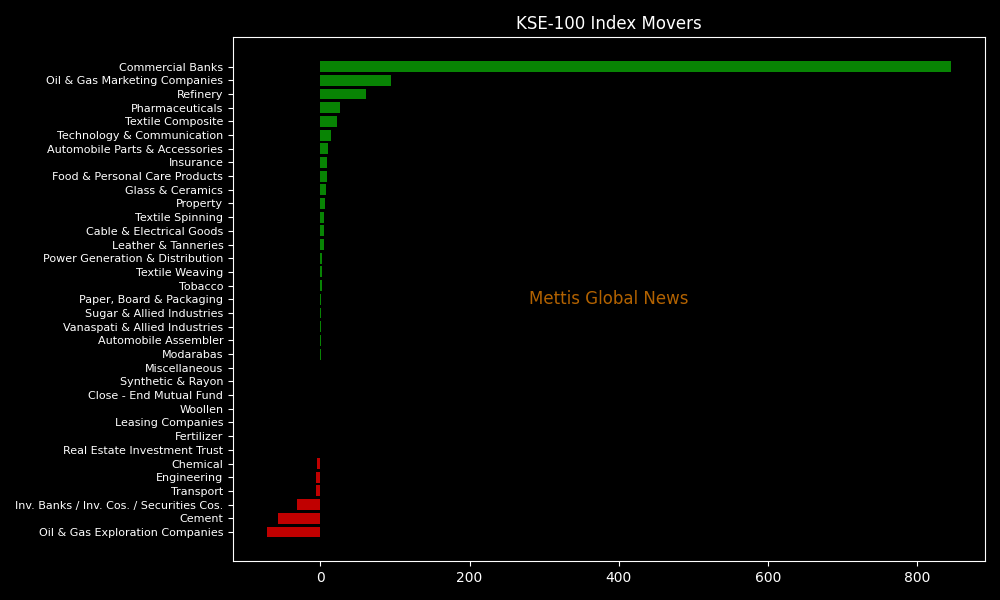 Sector-wise, the index was supported by Commercial Banks (+844.70 points), Oil & Gas Marketing Companies (+94.38 points), Refinery (+60.86 points), Pharmaceuticals (+26.06 points), and Textile Composite (+22.16 points). On the flip side, Oil & Gas Exploration Companies (-71.05 points) and Cement (-56.23 points) weighed on the index.