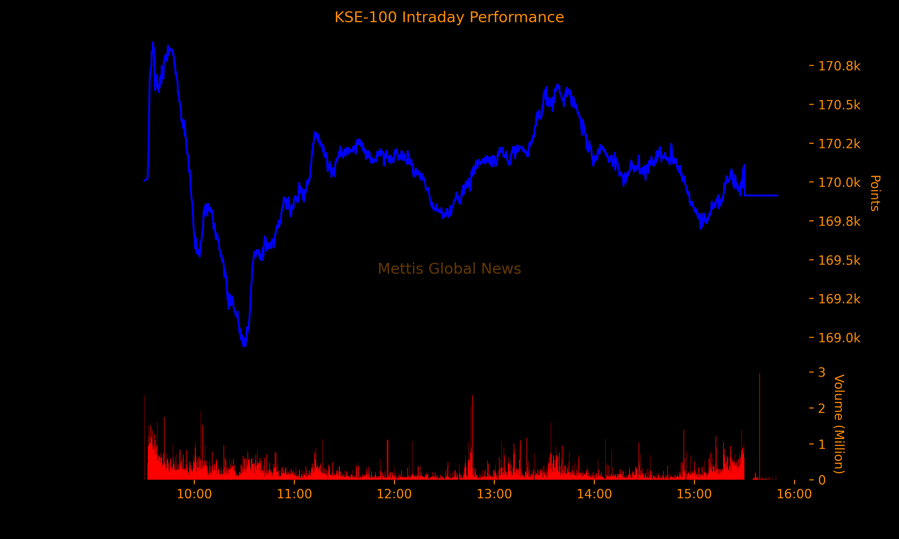 The KSE-100 Index closed at 169,911.95, up 1,392.01 points or 0.83%. The index remained in positive territory throughout the session, reaching an intraday high of 170,899.16 (+2,379.22 points) and a low of 168,941.31 (+421.37 points), reflecting sustained buying activity.