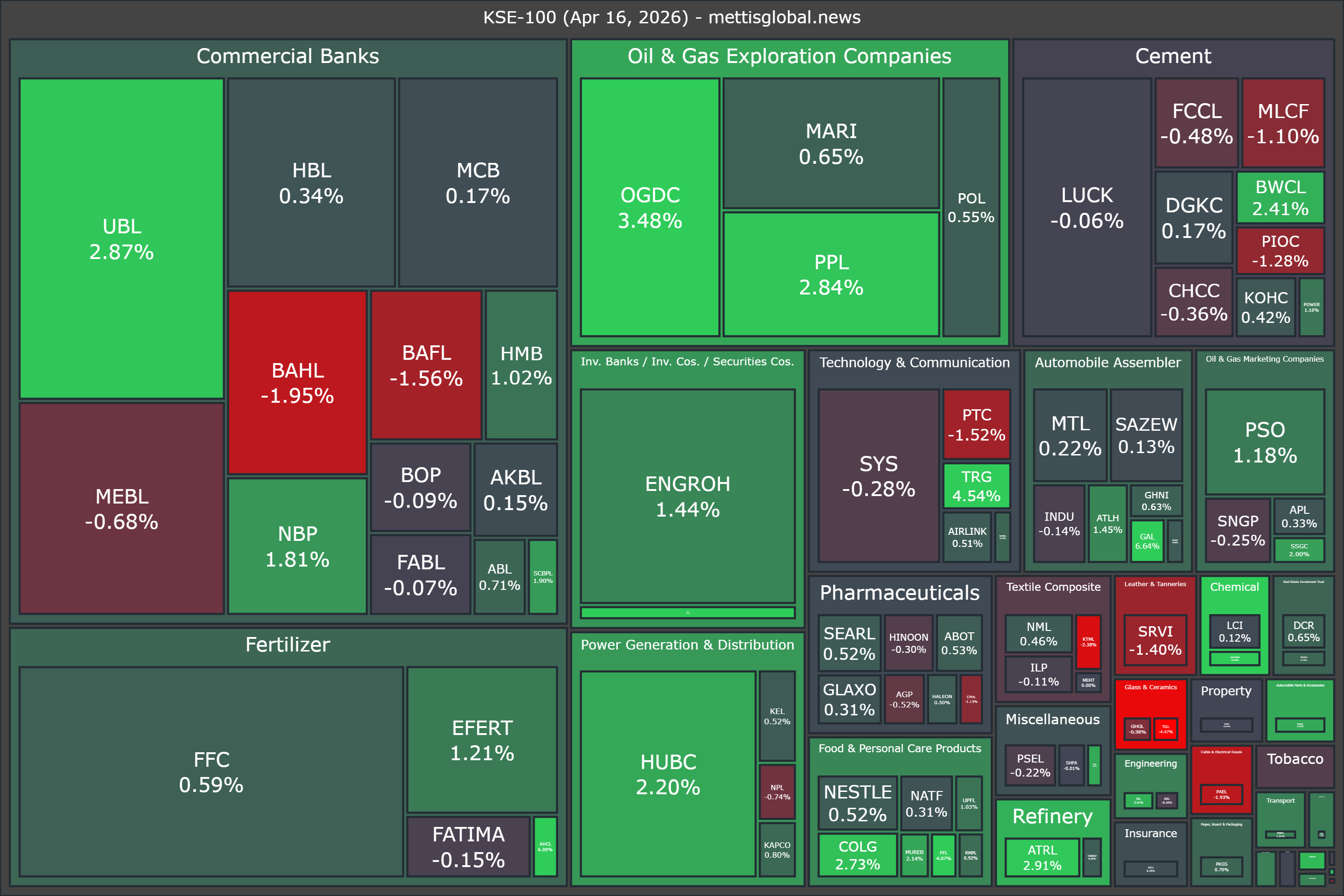 April 16, 2026 (MLN): Stocks at the Pakistan Stock Exchange continued their upward trajectory on Thursday, with the benchmark KSE-100 Index posting further gains as improved liquidity outlook and foreign inflows boosted investor confidence.