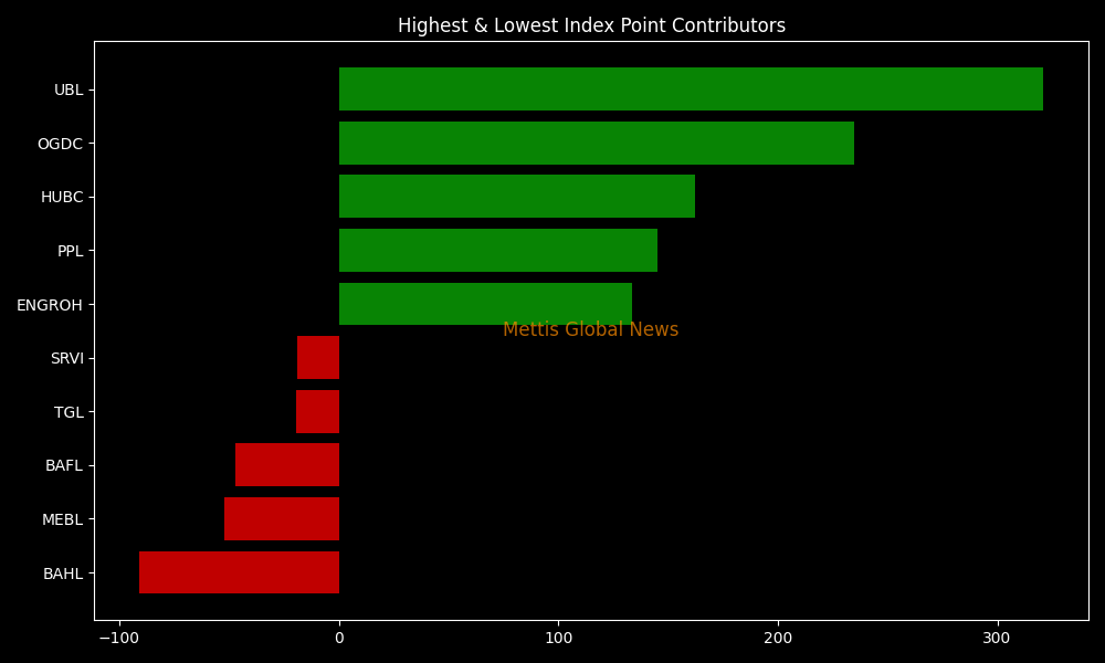 Among the top gainers, LOTCHEM (+10.00%), GAL (+6.64%), PSX (+6.21%), AHCL (+6.00%), and TRG (+4.54%) led the advance. On the other hand, losses were seen in TGL (-4.47%), KTML (-2.38%), BAHL (-1.95%), PAEL (-1.93%), and BAFL (-1.56%).
