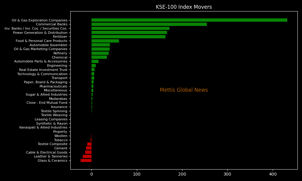 Sector-wise, the KSE-100 Index was supported by Oil & Gas Exploration Companies (+431.67 points), Commercial Banks (+254.46 points), Investment Banks/Companies/Securities Companies (+172.01 points), Power Generation & Distribution (+166.52 points), and Fertilizer (+163.08 points). Some weakness was observed in glass & ceramics, leather, cement, and textile sectors.