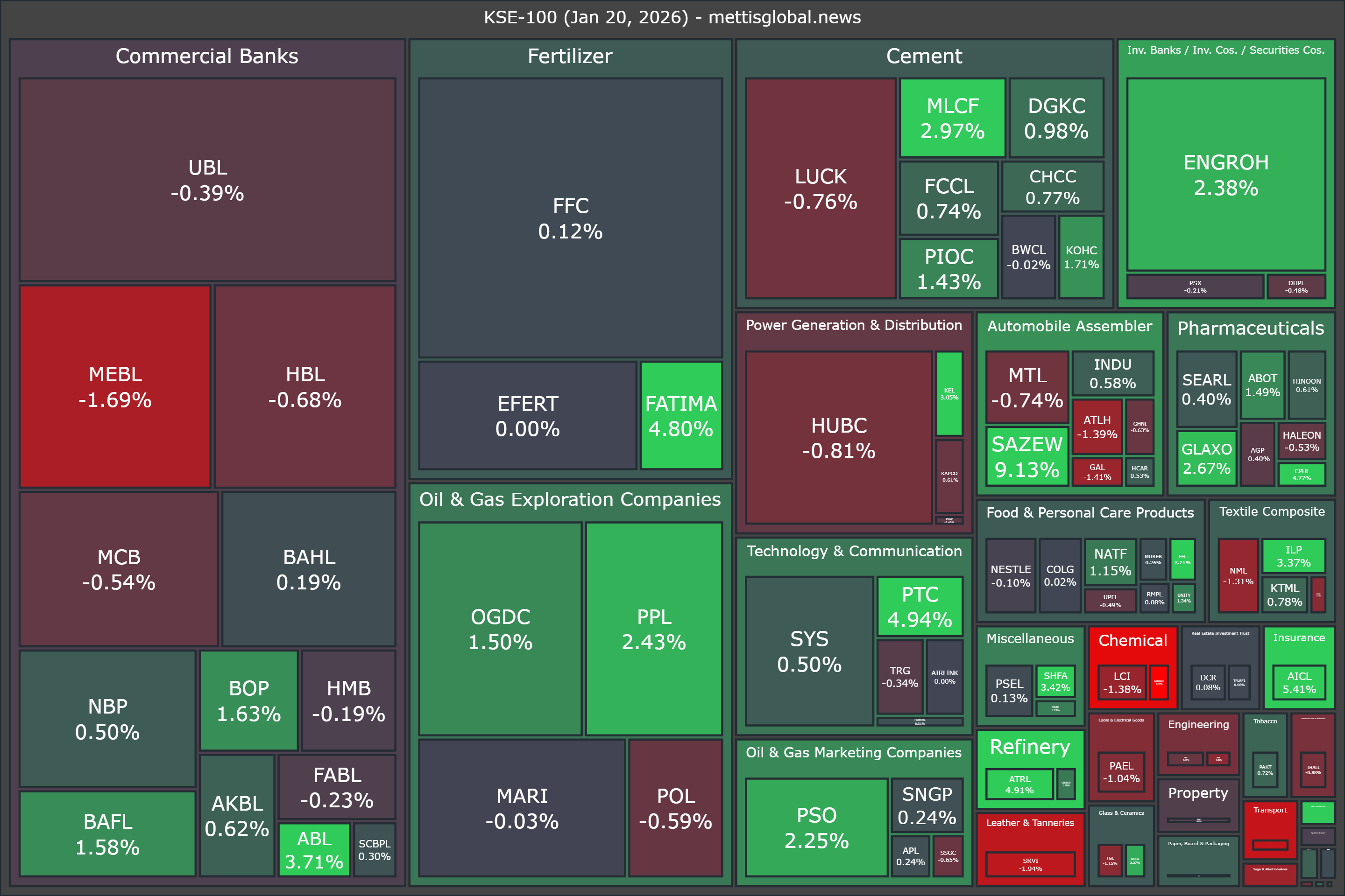January 20, 2026 (MLN): The benchmark KSE-100 Index concluded Tuesday's trading session at 188,621.78, showing an increase of 860.09 points or 0.46%.