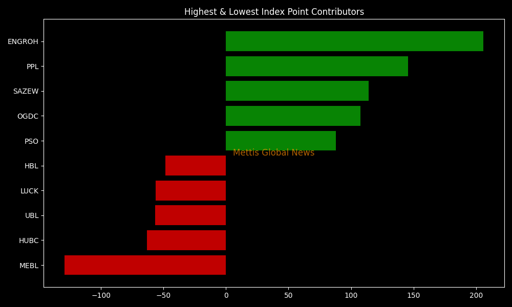 In terms of index-point contributions, companies that propped up the index were ENGROH (+205.80pts), PPL (+145.72pts), SAZEW (+114.13pts), OGDC (+107.46pts), and PSO (+87.89pts).