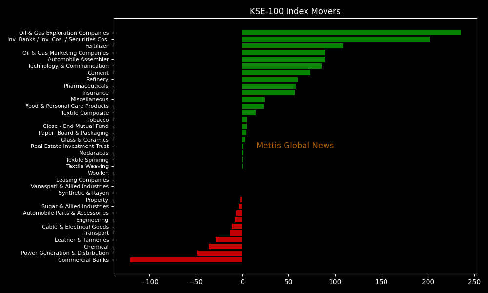 Sector-wise, KSE-100 Index was supported by Oil & Gas Exploration Companies (+235.05pts), Inv. Banks / Inv. Cos. / Securities Cos. (+202.19pts), Fertilizer (+108.35pts), Oil & Gas Marketing Companies (+89.26pts), and Automobile Assembler (+89.10pts).