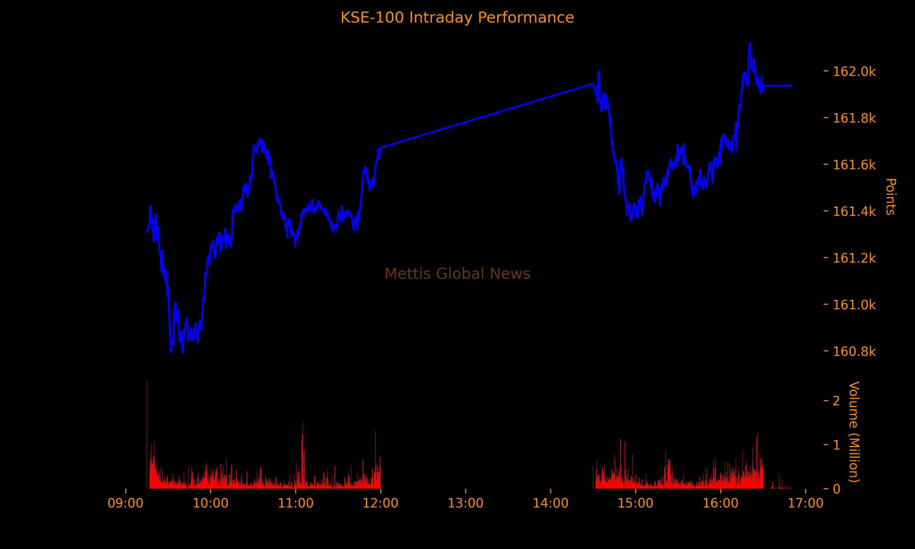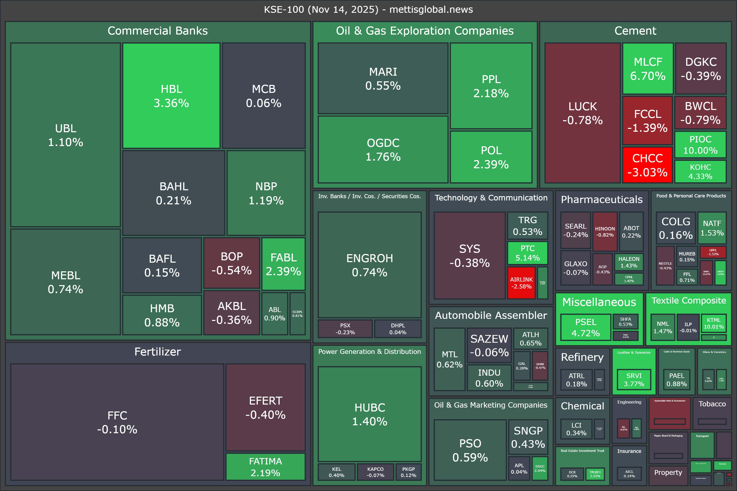 November 14, 2025 (MLN): The benchmark KSE-100 Index concluded Friday's trading session at 161,935.19, showing an increase of 1,277.70 points or 0.80%.