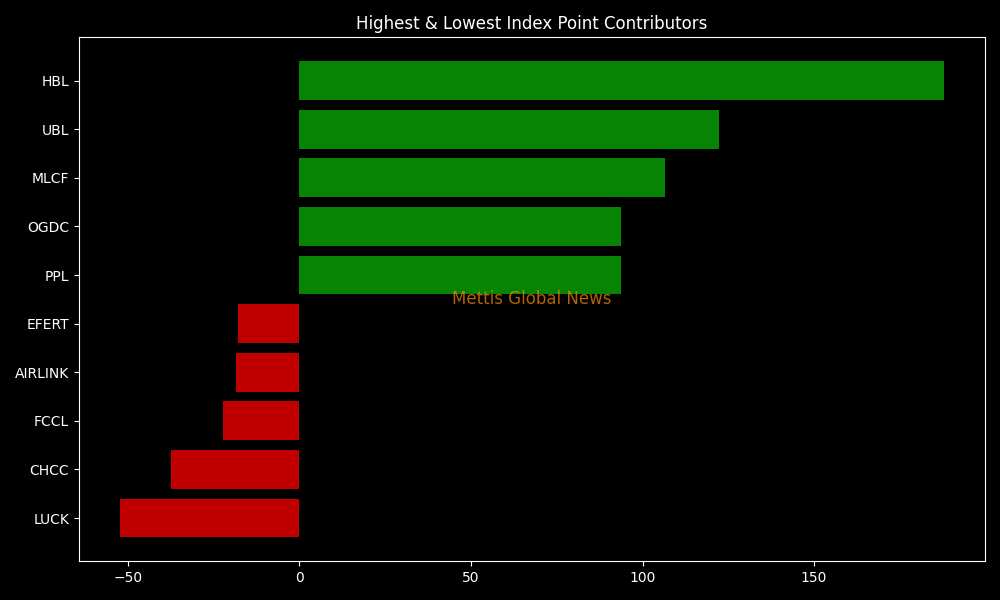 In terms of index-point contributions, companies that propped up the index were HBL (+187.81pts), UBL (+122.37pts), MLCF (+106.59pts), OGDC (+93.81pts), and PPL (+93.67pts).