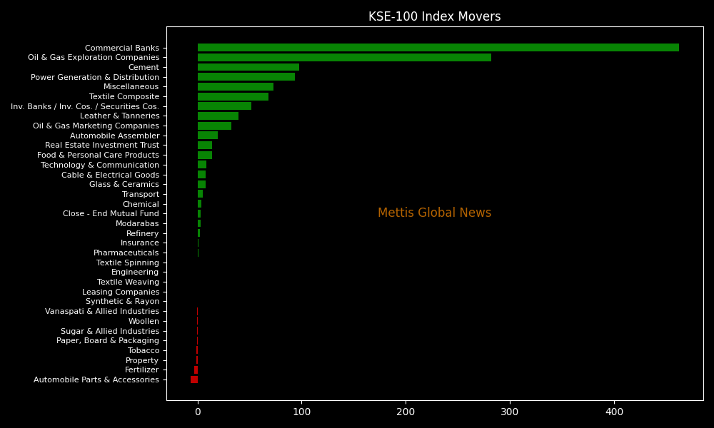 Sector-wise, KSE-100 Index was supported by Commercial Banks (+462.23pts), Oil & Gas Exploration Companies (+281.82pts), Cement (+97.72pts), Power Generation & Distribution (+93.50pts), and Miscellaneous (+72.91pts).
