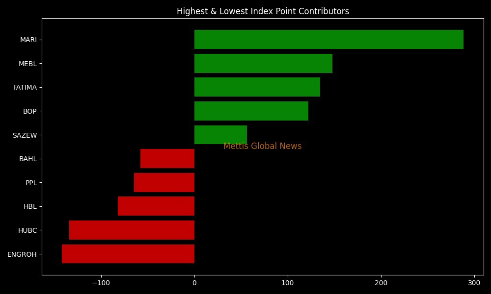 In terms of index-point contributions, companies that propped up the index were MARI (+288.70pts), MEBL (+147.89pts), FATIMA (+135.13pts), BOP (+122.53pts), and SAZEW (+56.25pts).