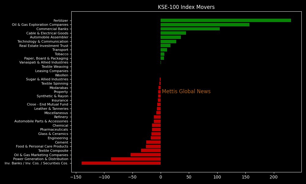 Sector-wise, KSE-100 Index was supported by Fertilizer (+230.46pts), Oil & Gas Exploration Companies (+156.97pts), Commercial Banks (+104.38pts), Cable & Electrical Goods (+44.71pts), and Automobile Assembler (+36.00pts).