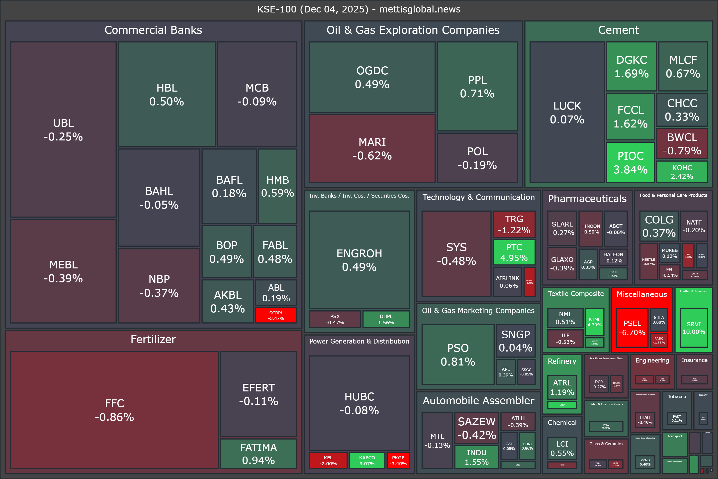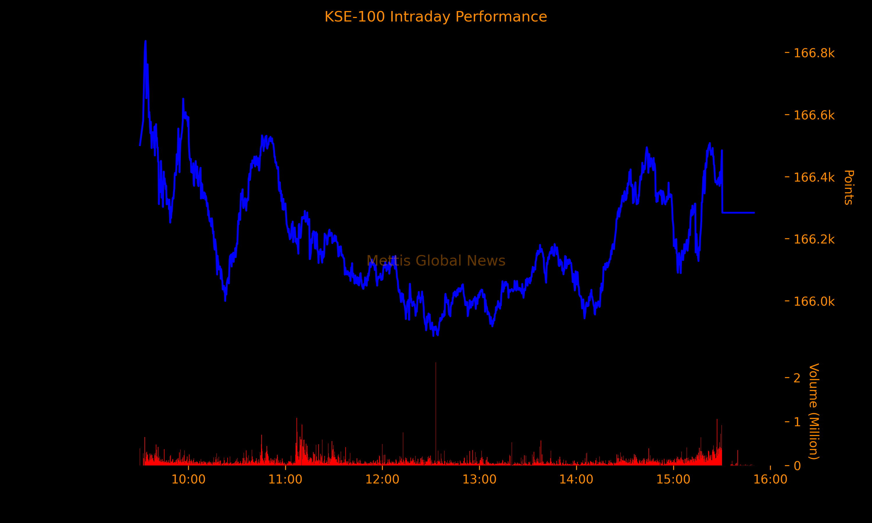 December 04, 2025 (MLN): The benchmark KSE-100 Index concluded Thursday's trading session at 166,283.55, showing an increase of 138.21 points or 0.08%.