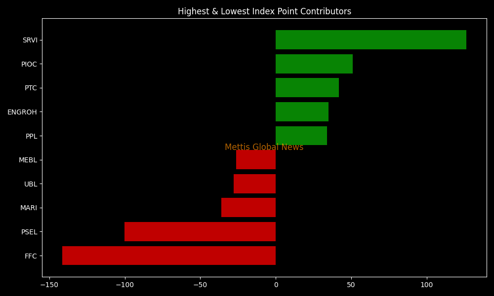 Meanwhile, companies that dragged the index lower were FFC (-141.35pts), PSEL (-100.30pts), MARI (-36.15pts), UBL (-27.76pts), and MEBL (-26.37pts).
