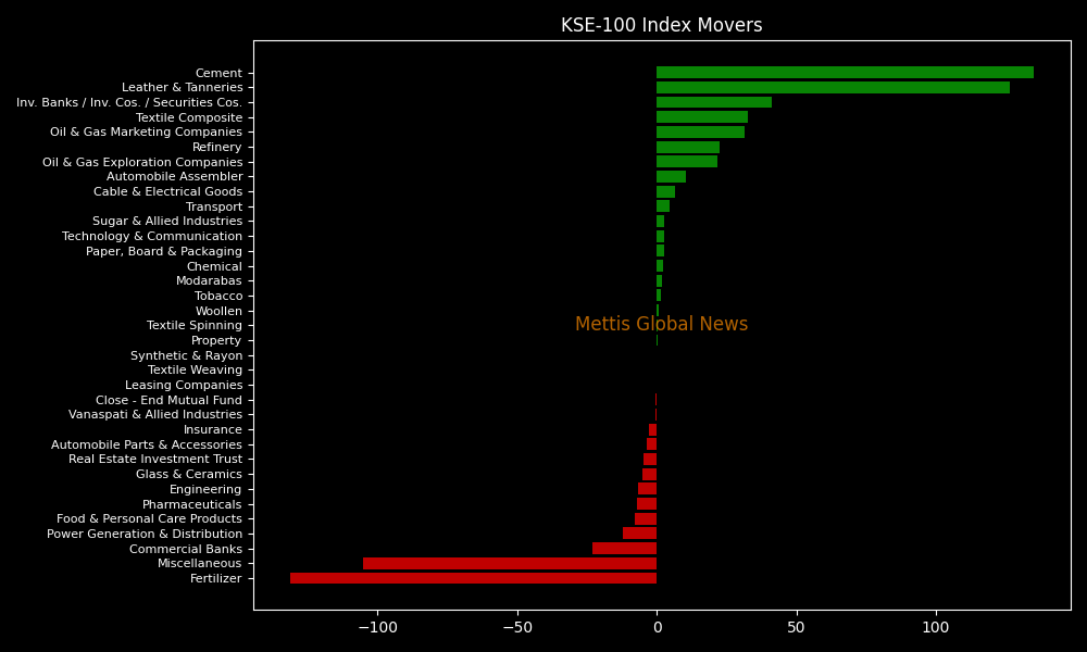Sector-wise, KSE-100 Index was supported by Cement (+134.92pts), Leather & Tanneries (+126.28pts), Inv. Banks / Inv. Cos. / Securities Cos. (+41.25pts), Textile Composite (+32.65pts), and Oil & Gas Marketing Companies (+31.67pts).