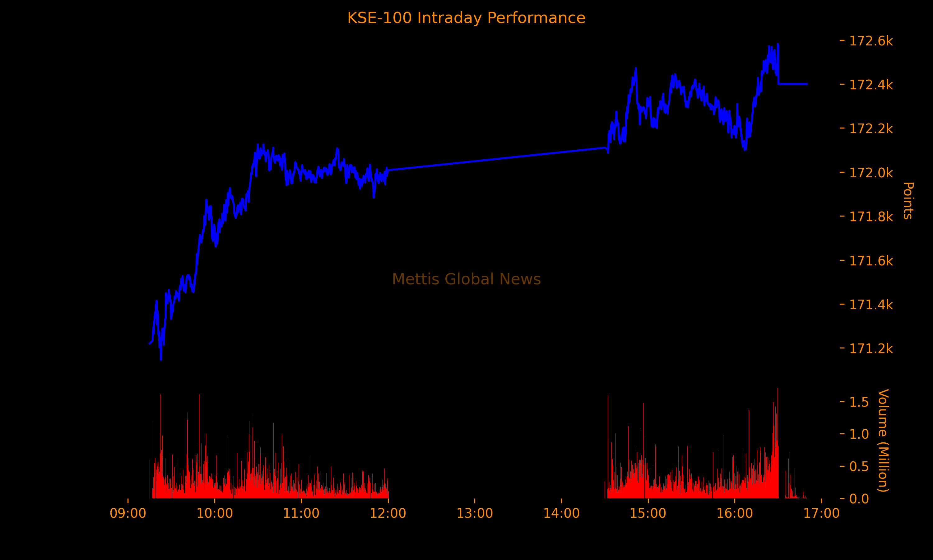 December 27, 2025 (MLN): The benchmark KSE-100 Index concluded Friday's trading session at 172,400.73, showing an increase of 1,570.51 points or 0.92%.