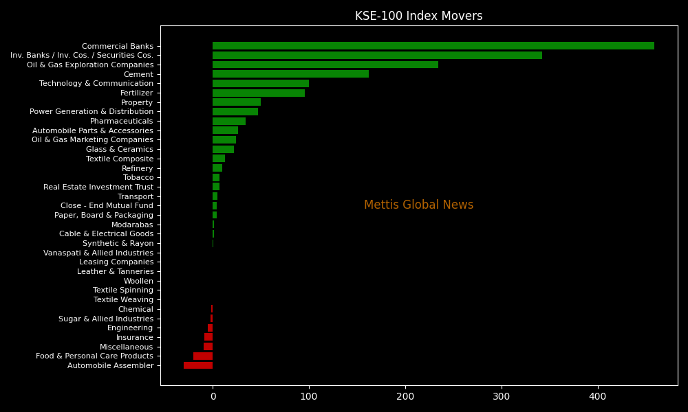Sector-wise, KSE-100 Index was supported by Commercial Banks (+458.61pts), Inv. Banks / Inv. Cos. / Securities Cos. (+342.32pts), Oil & Gas Exploration Companies (+234.18pts), Cement (+162.28pts), and Technology & Communication (+99.99pts).