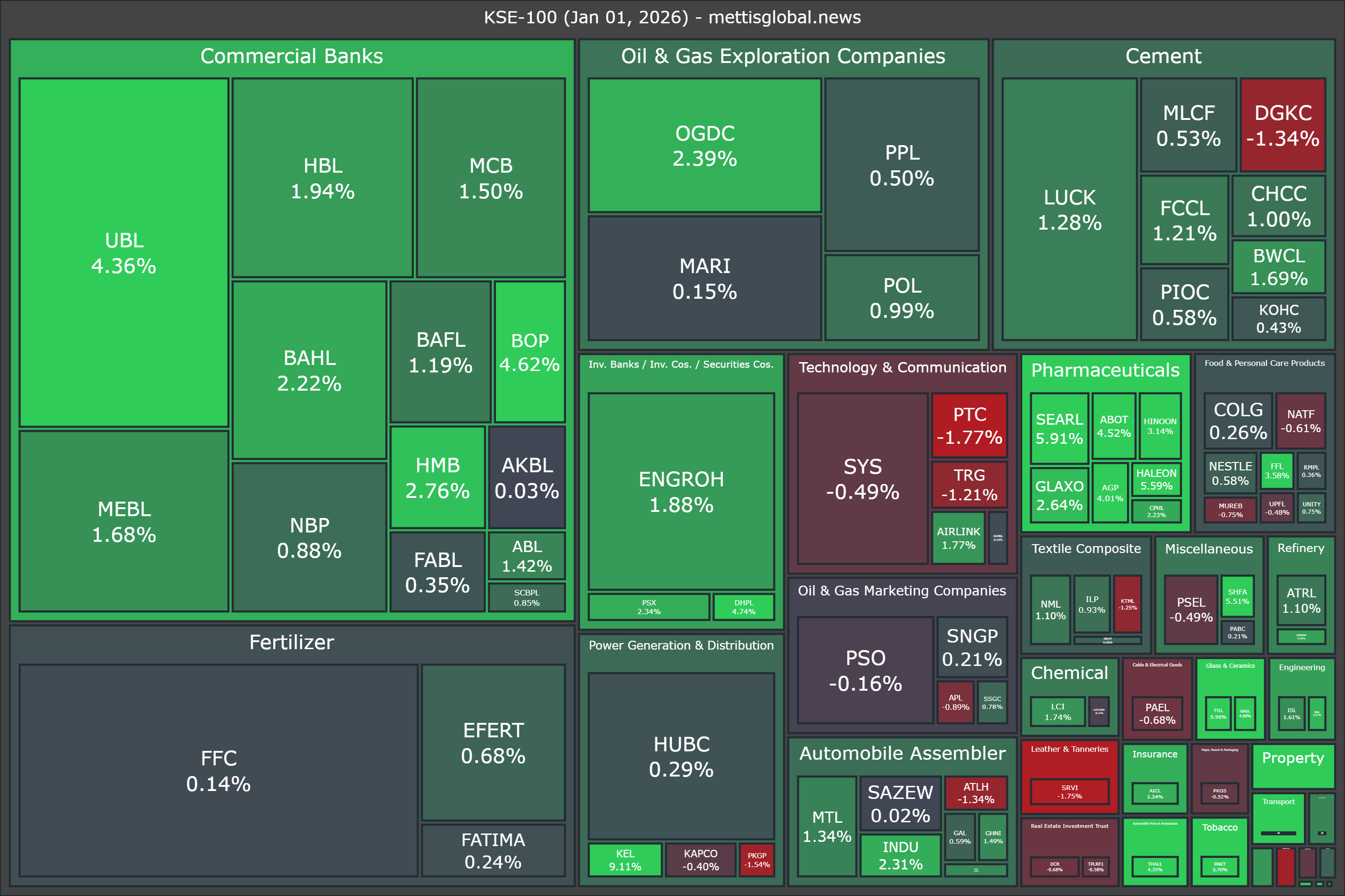 January 01, 2026 (MLN): The benchmark KSE-100 Index concluded Thursday's trading session at 176,355.49, showing an increase of 2,301.17 points or 1.32%.