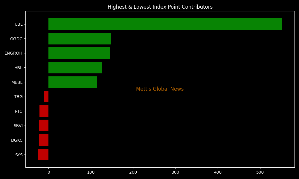 In terms of index-point contributions, companies that propped up the index were UBL (+552.61pts), OGDC (+147.89pts), ENGROH (+146.03pts), HBL (+125.51pts), and MEBL (+114.23pts).