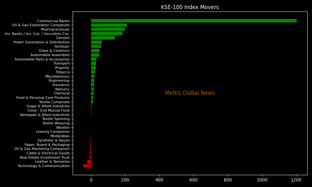 Sector-wise, KSE-100 Index was supported by Commercial Banks (+1203.00pts), Oil & Gas Exploration Companies (+210.18pts), Pharmaceuticals (+196.98pts), Inv. Banks / Inv. Cos. / Securities Cos. (+182.53pts), and Cement (+139.41pts).
