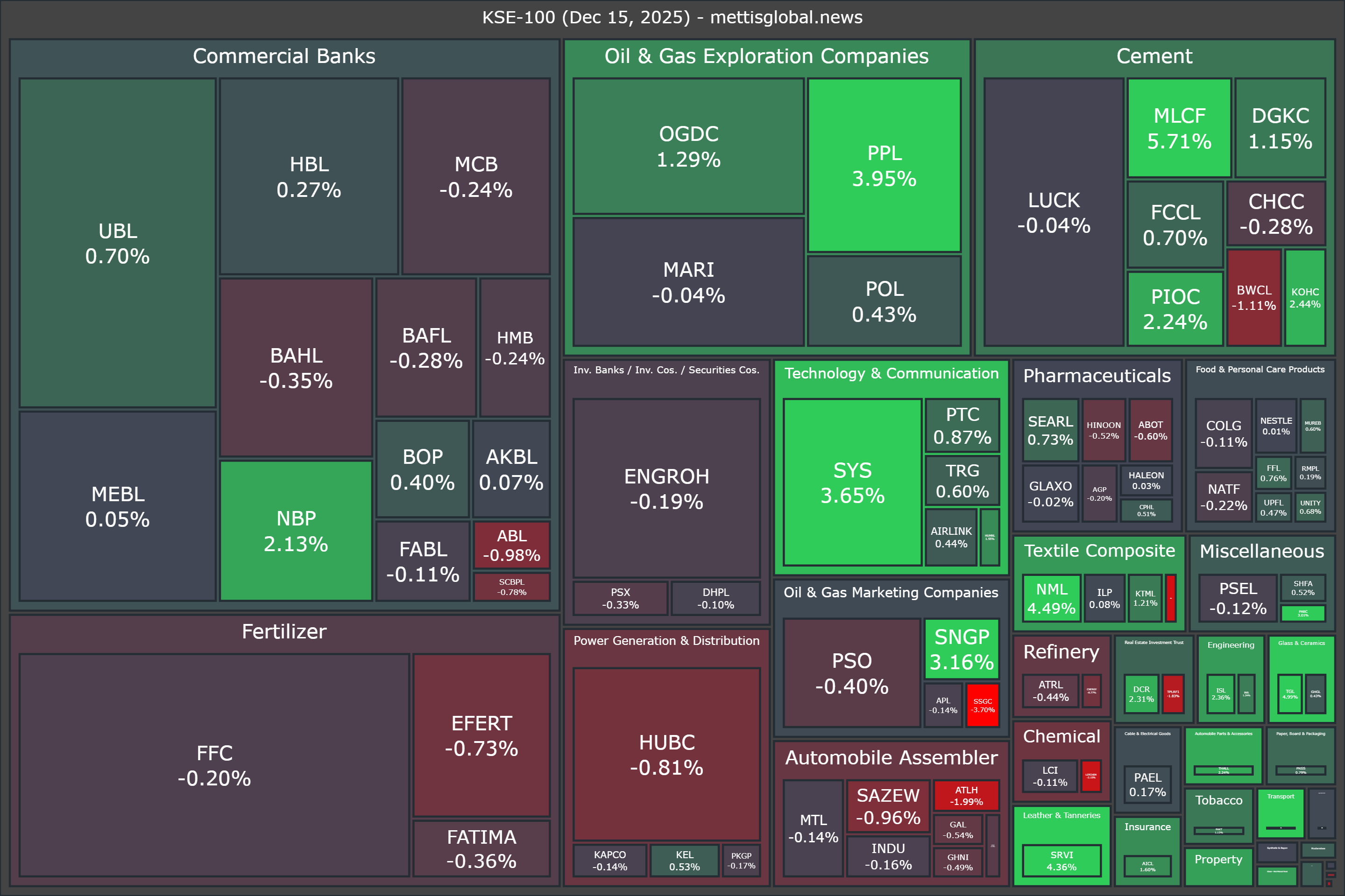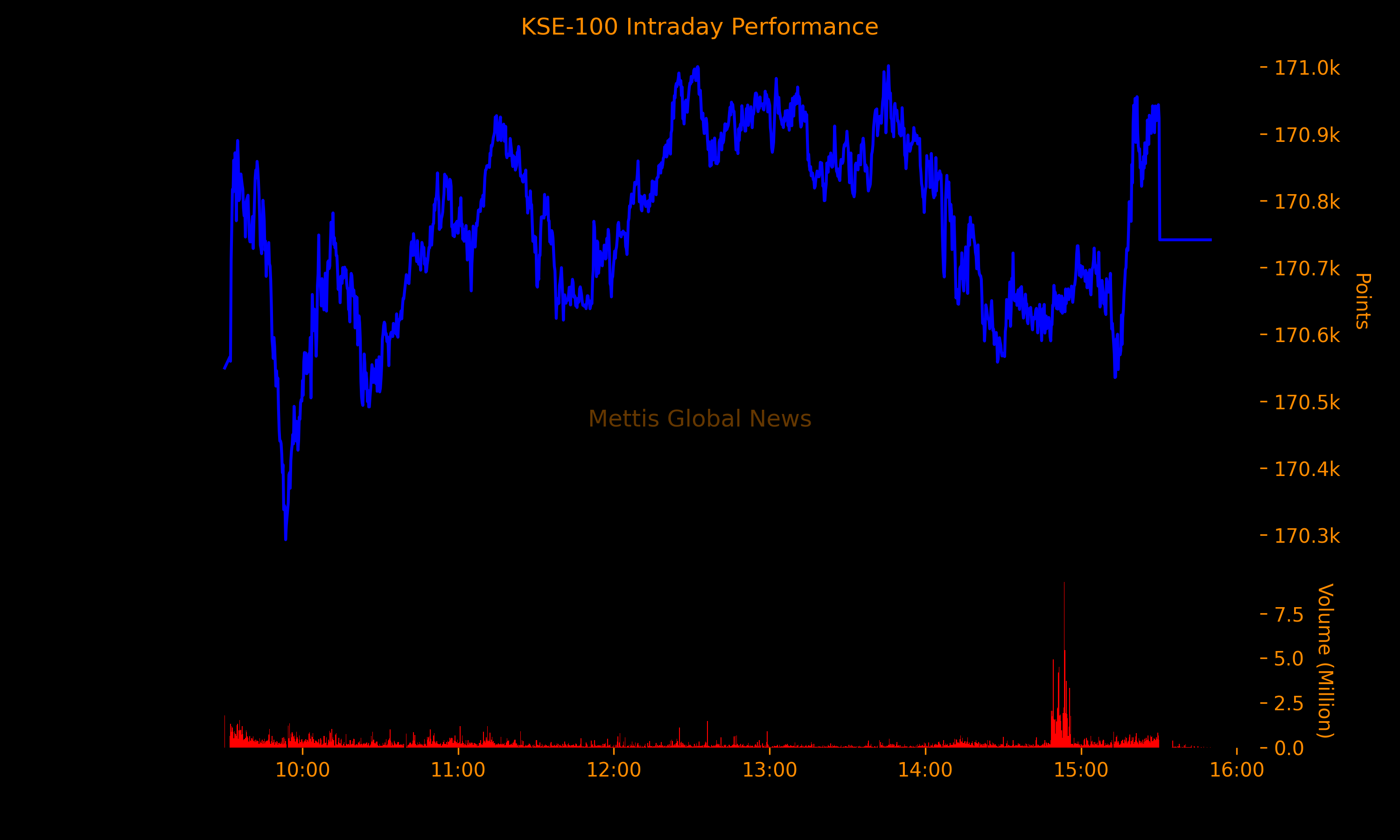 December 15, 2025 (MLN): The benchmark KSE-100 Index concluded Monday's trading session at 170,741.34, showing an increase of 876.82 points or 0.52%.