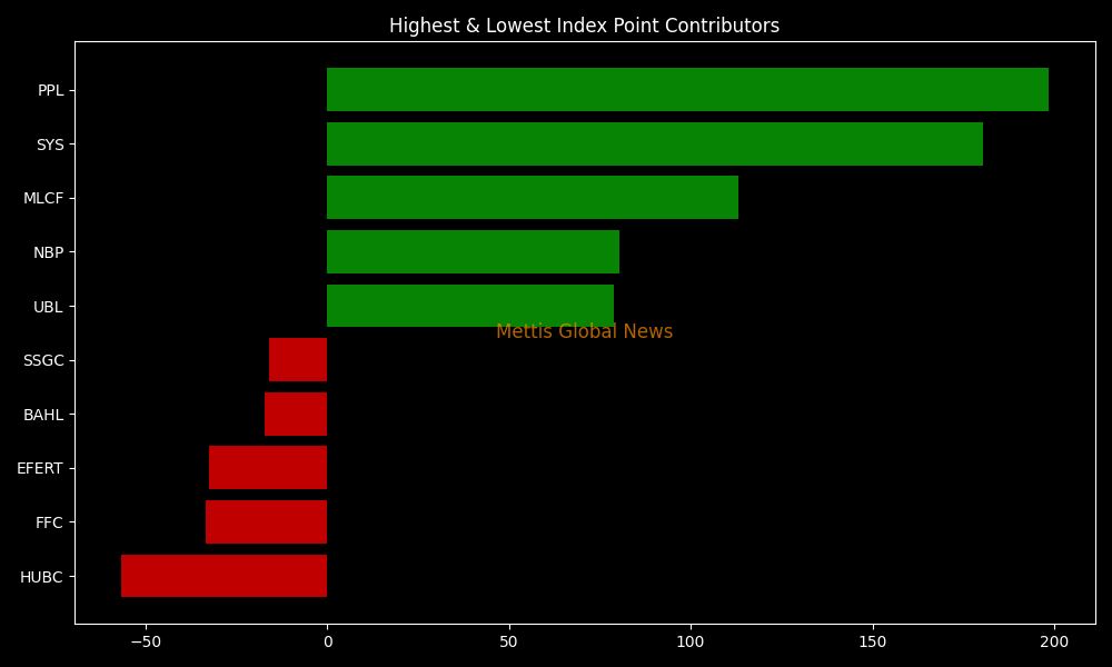 In terms of index-point contributions, companies that propped up the index were PPL (+198.55pts), SYS (+180.48pts), MLCF (+113.03pts), NBP (+80.39pts), and UBL (+78.81pts).