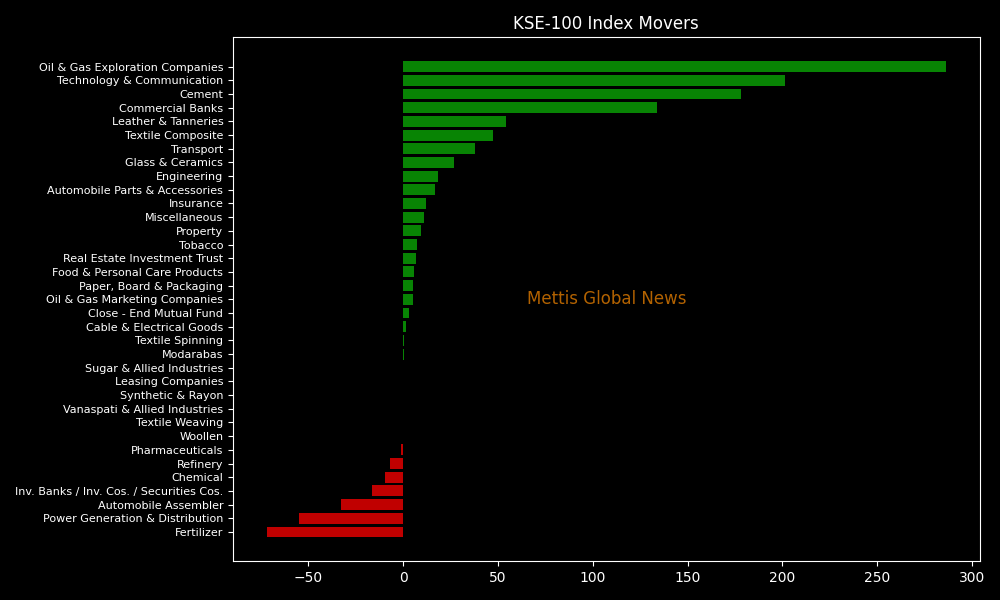 Sector-wise, KSE-100 Index was supported by Oil & Gas Exploration Companies (+286.00pts), Technology & Communication (+201.26pts), Cement (+178.33pts), Commercial Banks (+134.05pts), and Leather & Tanneries (+54.10pts).