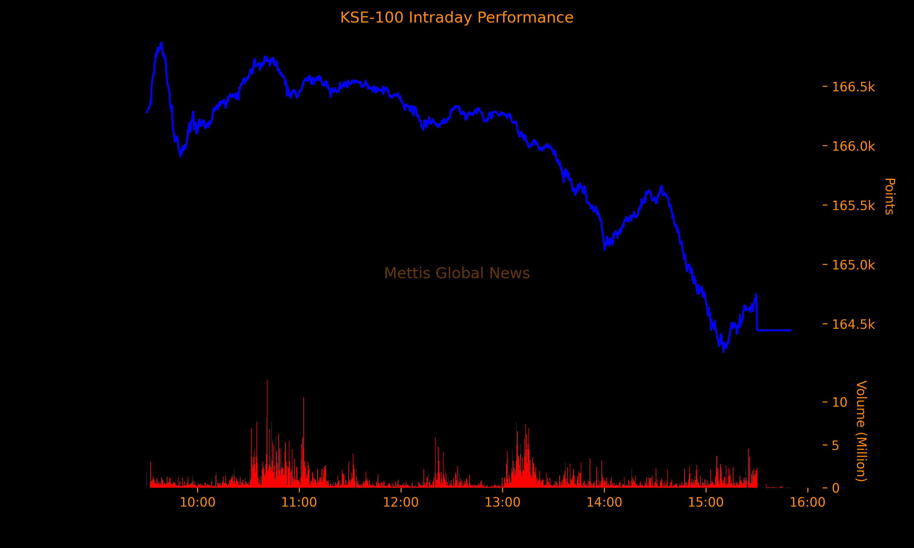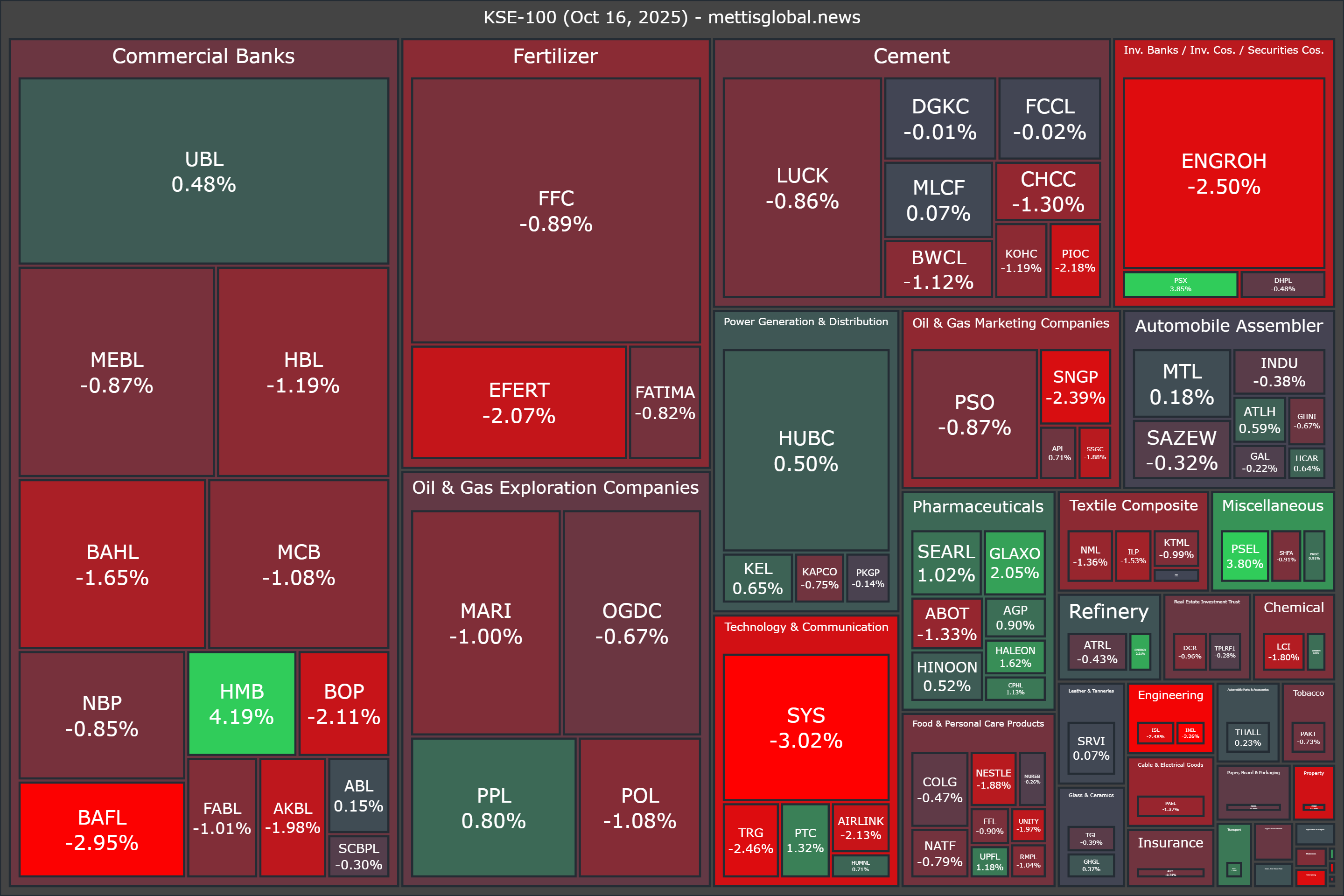 October 16, 2025 (MLN): The benchmark KSE-100 Index concluded Thursday's trading session at 164,444.71, showing a decrease of 1,241.67 points or 0.75%.