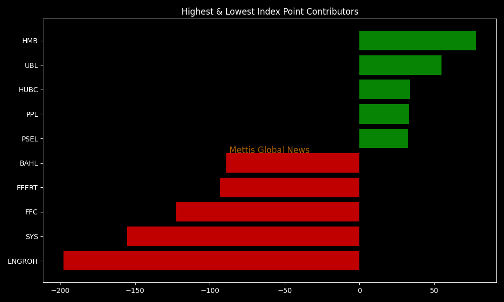 In terms of index-point contributions, companies that dragged the index lower were ENGROH (-197.66pts), SYS (-155.34pts), FFC (-122.72pts), EFERT (-93.42pts), and BAHL (-89.08pts).