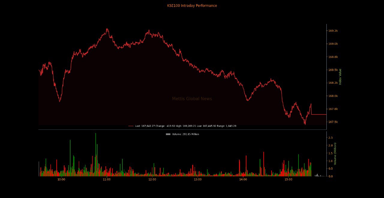 KSE100 Index closed Tuesday's trading session at 167,642.27 showing a decrease of 0.25 percent or 419.92 points.