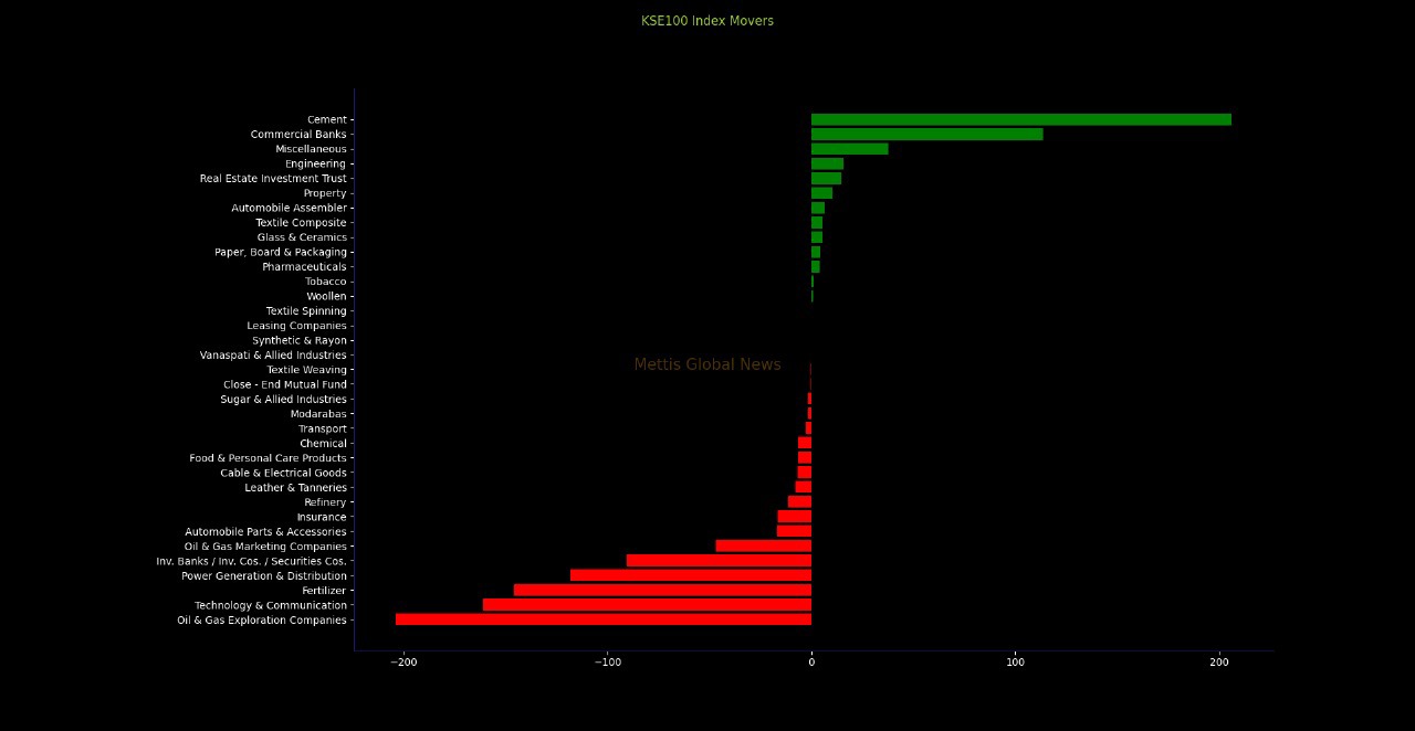 KSE100 Index was let down by Oil & Gas Exploration Companies with 203.92, Technology & Communication with 161.28, Fertilizer with 146.09, Power Generation & Distribution with 118.1 and Inv. Banks / Inv. Cos. / Securities Cos. with 90.69 points.