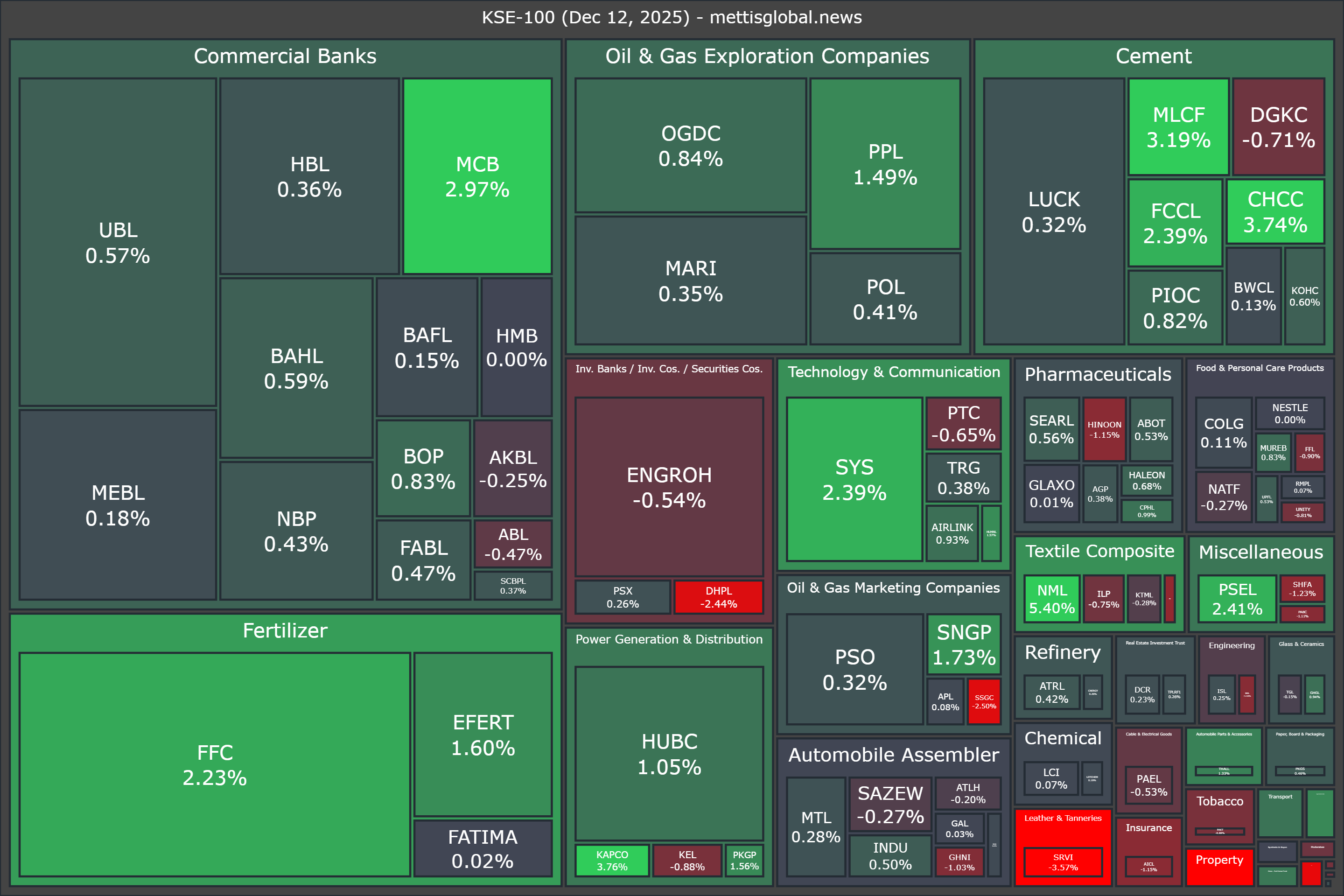Top gainers during the day were NML (+5.40%), KAPCO (+3.76%), CHCC (+3.74%), MLCF (+3.19%), and MCB (+2.97%).