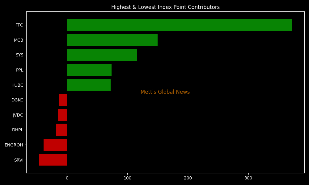 In terms of index-point contributions, companies that propped up the index were FFC (+371.67pts), MCB (+150.03pts), SYS (+115.61pts), PPL (+73.63pts), and HUBC (+72.37pts).